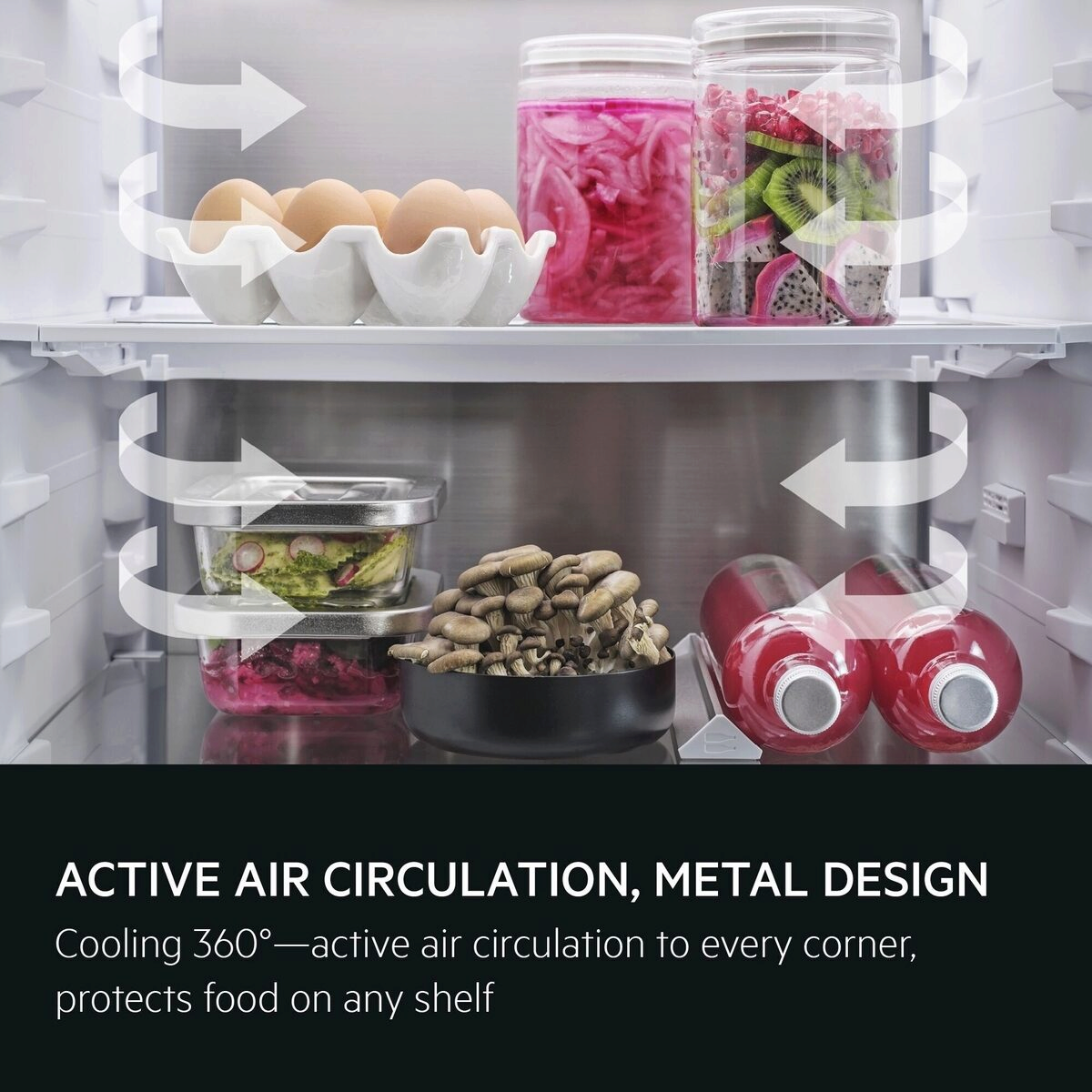 The AEG 8000 Series Cooling 360° Fridge Freezer has multiple air channels to deliver consistent cooling. This protects food on every shelf and can help to reduce food waste by 28%*. Stainless steel in the interior creates an elegant, premium look for your kitchen.