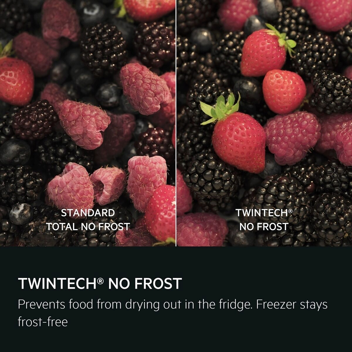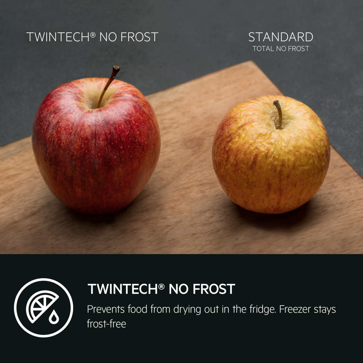 TwinTech® NoFrost: Dual cooling keeps humidity in the fridge to prevent food from drying out, while the freezer stays frost-free.